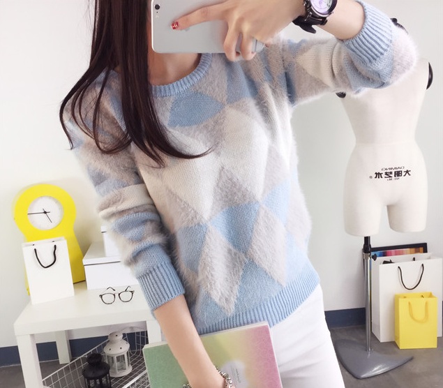 เสื้อไหมพรมแฟชั่นแขนยาวสีฟ้า คอกลม ลายเสื้อข้าวหลามตัด เนื้อผ้าหนา คุณภาพงานดีค่ะ